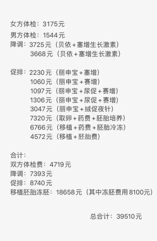 体外受精(IVF):将精子和卵子在体外受精,费用根据受精方法和胚胎数量而定,通常在1-3万元。